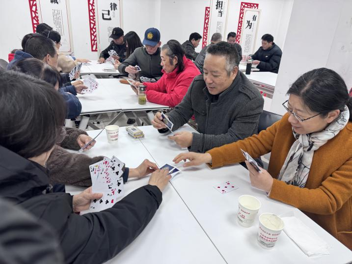 活動現場氣氛熱烈,社區內眾多摜蛋愛好者齊聚一堂,以牌會友、切磋技藝。作為一項兼具趣味性、競技性與社交性的撲克游戲,摜蛋深受各年齡段居民的喜愛。比賽中,選手們時而凝神思索,時而默契配合,在輕松愉快的氛圍里展現著智慧與協作的魅力。這場比賽不僅是智力的較量,更是社區凝聚力的生動寫照。長干里社區新時代文明實踐站與社區文化站始終致力于開展形式多樣、內容豐富的群眾文化活動,通過此類賽事進一步推動社區文化建設,增強居民的歸屬感與幸福感。