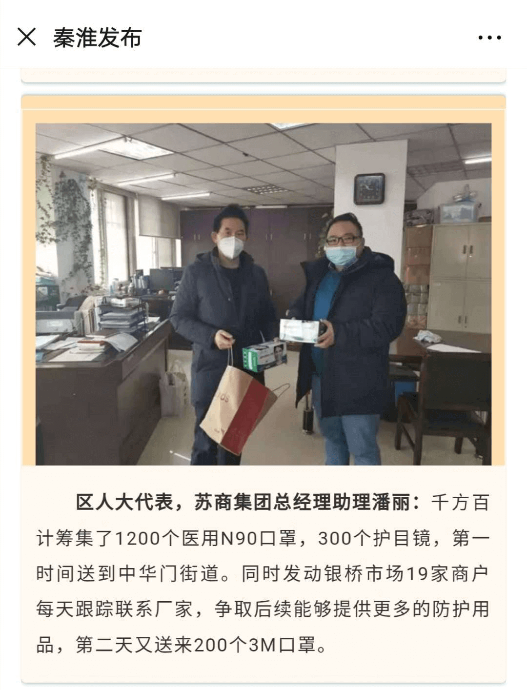 ↑集團子公司南京銀橋國際生活廣場有限公司發(fā)動多家商戶,積極組織口罩、護目鏡等緊缺物資,捐贈給中華門街道等部門。
