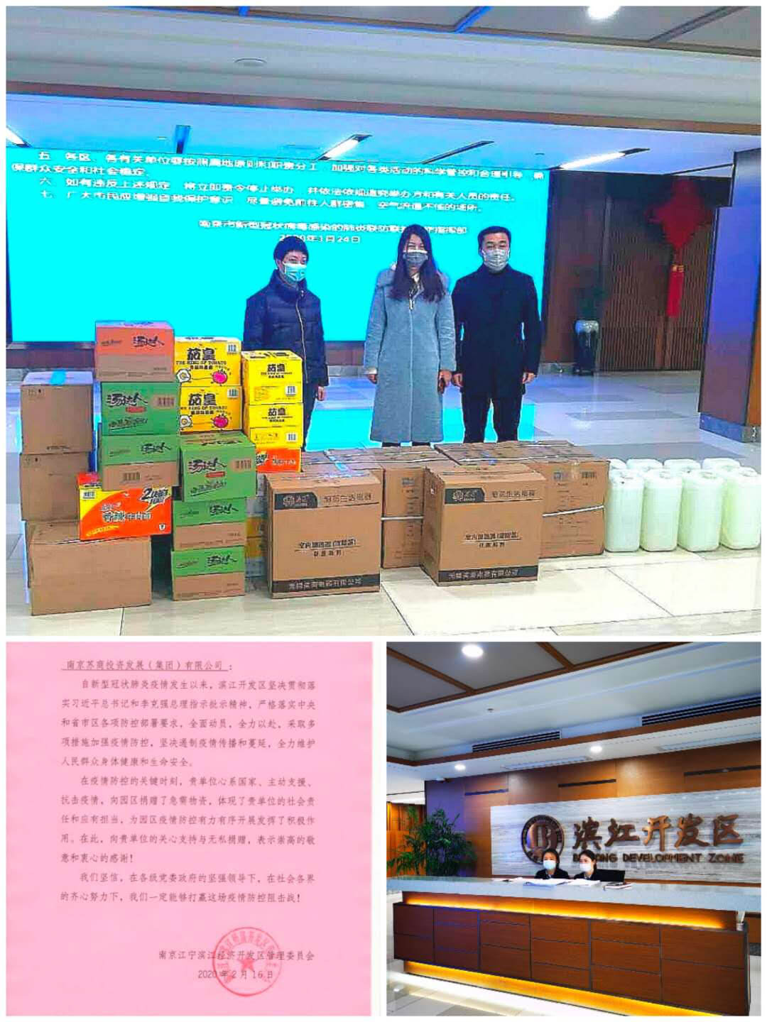 ↑2月15日上午,受董事長陳家俊先生委托,集團工會赴江寧濱江開發(fā)區(qū)管委會捐贈取暖器、84消毒液、牛奶、方便食品等戰(zhàn)“疫”急需物資。濱江開發(fā)區(qū)管委會辦公室和工會的領(lǐng)導(dǎo)熱情接待了集團總經(jīng)理助理楊華女士一行,對此次捐贈活動表示衷心感謝并給予高度評價。