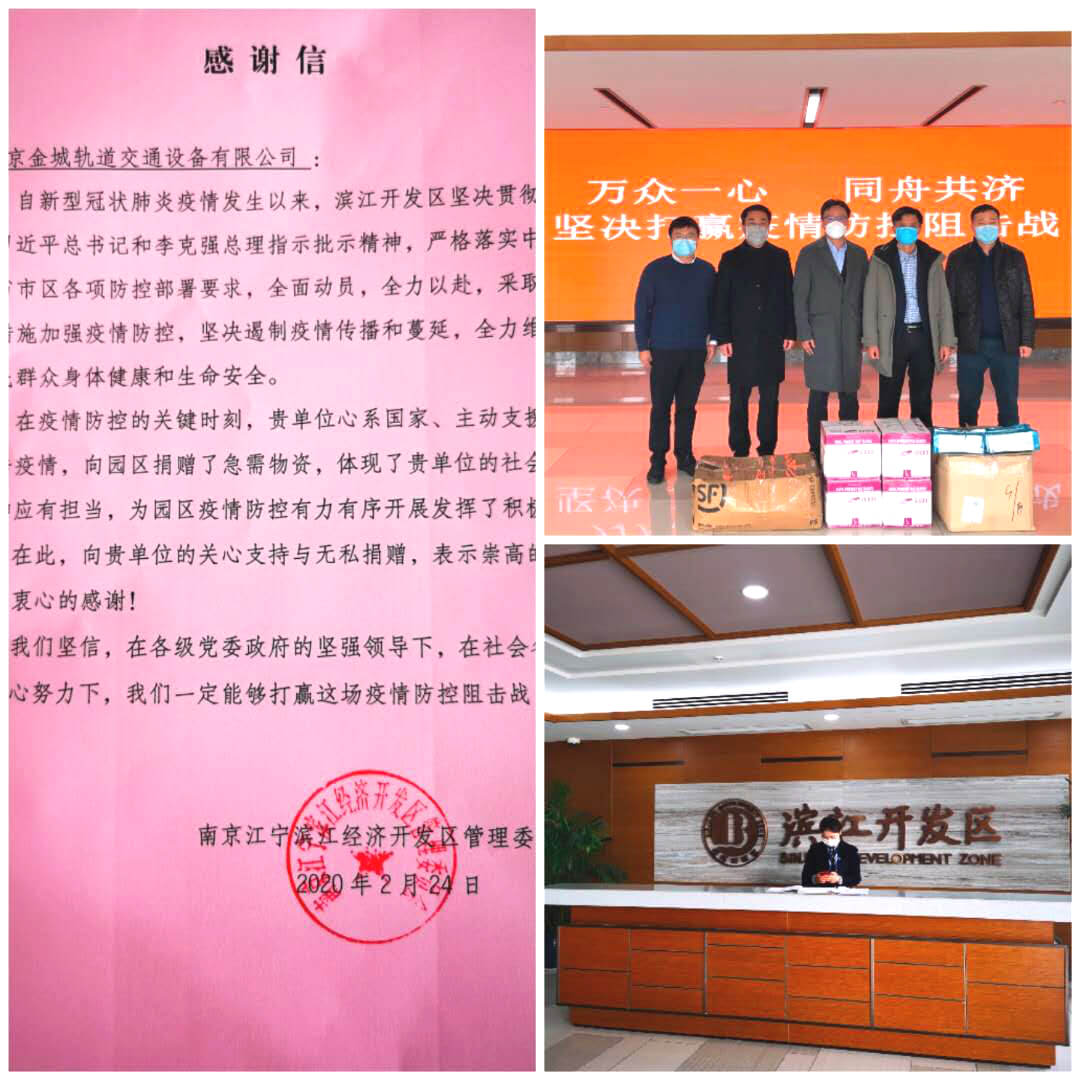 ↑2月25日,蘇商集團子公司南京金城軌道交通設(shè)備有限公司還向有關(guān)業(yè)務(wù)單位捐贈口罩、橡膠手套、額溫槍等戰(zhàn)“疫”物資,得到了業(yè)務(wù)單位的高度贊揚。