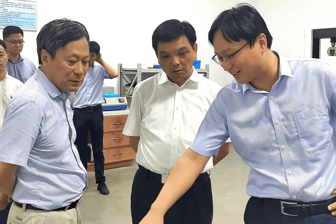↑蘇商集團陳家俊董事長(左)和副總經理陳寅同志(右)陪同南京江寧濱江開發區黨工委萬振華書記(中)參觀南京金城軌道公司產品實驗室。