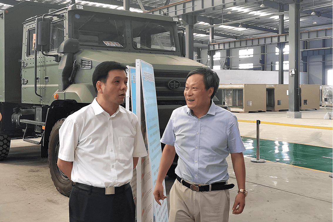 ↑蘇商集團陳家俊董事長(右)陪同南京江寧濱江開發區黨工委萬振華書記(左)參觀南京金城軌道公司生產車間。