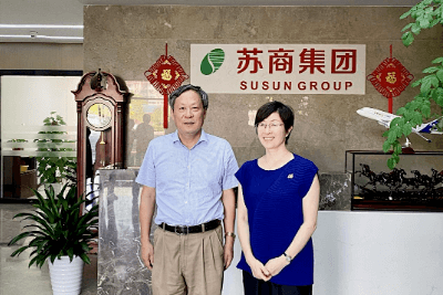 ↑陳家俊董事長(zhǎng)(左一)和蔡亮主任( 右)在蘇商集團(tuán)總部合影留念